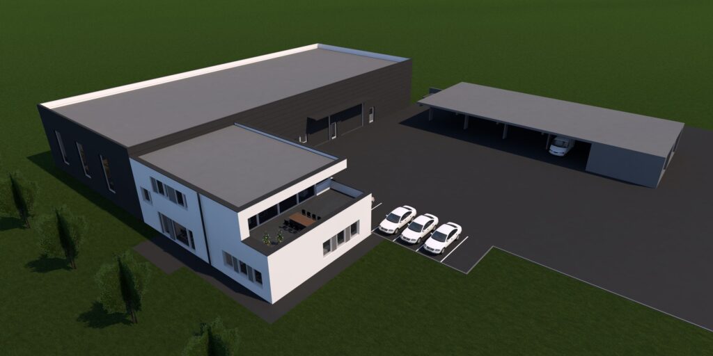 Quadratmetern werden ein neues Betriebsgebäude inklusive Büro und Halle, ein Flugdachbereich mit Garage