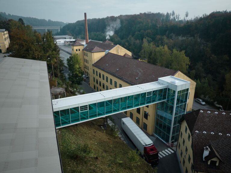 Die gesamte Stahlkonstruktion wurde mit einer verglasten Pfosten-Riegel-Fassade eingehaust. Spannend war bei diesem Projekt das Einheben der Brücke, die in Teile vorgefertigt angeliefert und sodann mittels Kran an ihren Platz gehoben wurde.
