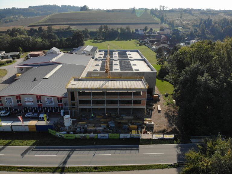 Der zweite Bauabschnitt – Neubau Bürogebäude und Außenanlage – zur Erweiterung des Firmenstandortes der Zipper Maschinen GmbH wurde im Juli begonnen. So konnten in der Zwischenzeit die Baumeisterarbeiten abgeschlossen und die Dachdeckerarbeiten gestartet werden. Sehr spannend war besonders der Anbau an das bereits bestehende Gebäude.