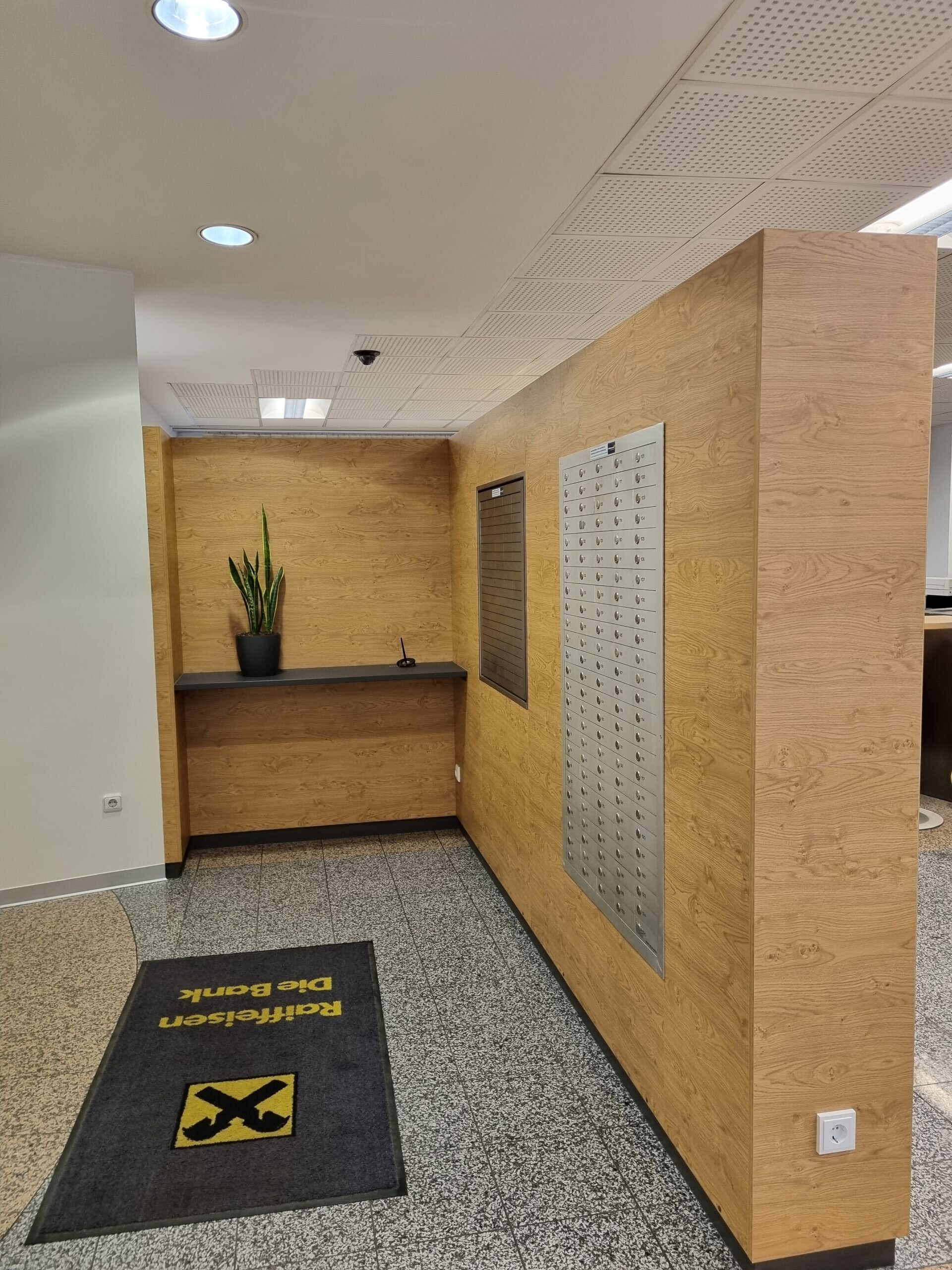 - Fertigung und Montage eines freistehenden Raumteilers mit integrierten Sparbuchschließfächern